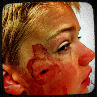 To be completely fair, I think it was only the first two rows of kids that were shot with shrapnel (well maybe shrapnel isn't the right word, but it best describes it), or received some kind of burn. And babies crying, I think it was only Millie. She didn't love the noise.